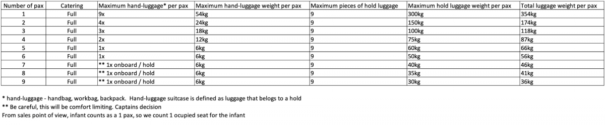 8.4.2 The weight limits for the transported baggage are listed in the Annex. The limits specified in the Annex are indicative; the decision on the placement of baggage on the aircraft is at the discretion of the aircraft captain. The transport of baggage that exceeds the specified limits must be expressly approved by the Company and stated in the Charter Agreement.